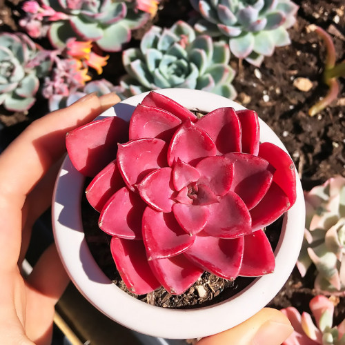 Ехеверія Miranda red - різновид гібрида Міранда, який славиться низько розташованими листовими розетками, які за формою нагадують лотос. Листя пофарбоване в приємний червоний колір. Влітку або восени з'явиться квітконос з милими яскравими квітками. Рослина відмінно виглядає в горщику, поєднується з іншими сукулентами, які люблять багато світла. Квітка добре себе почуває у квартирі, офісі, на балконі й навіть в літньому саду, оскільки здатна рости при +4 C. Культура в природних умовах йде на зимовий спокій при +10-12 C, але в домашніх умовах ехеверіі це робити не обов'язково. Порадуйте себе популярною новинкою, замовивши рослину в контейнері.