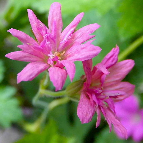 Герань Southcombe Double - махровий сорт. Яскраво-фіолетові квітки змагаються за красою з мініатюрними трояндами. Вони прикрашають ажурні кущики з червня до серпня. Кожна квітка досягає 4-5 см у діаметрі. Терпкий аромат листя відганяє шкідників, що зручно для дачної ділянки. Садова махрова герань невибаглива, як і звичайні сорти. Вона росте практично без догляду, до 10 років одному місці. Це рослина для зайнятих садівників або дачників.