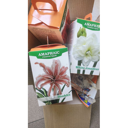 Купуючи гіпеаструм в інтернеті на сайті Яскрава Клумба, ви отримуєте цибулини + подарункову упаковку. Перед посадкою огляньте їх, приберіть коричневі лусочки. В горщику зробіть дренажний шар, підготуйте легку ґрунтосуміш, цибулину поглибте на 2/3 в землю, полийте.