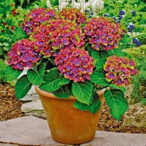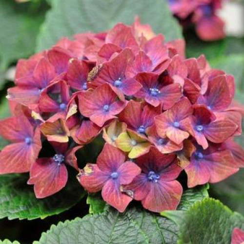 Гортензія Schloss Wackerbarth (Шлосс Вакербарт) великолиста - кущ з таким фантастичним забарвленням суцвіть, що його важко описати. Справжня гортензія-хамелеон! Кулясті суцвіття, пелюстки квіток спочатку - зелені, у міру росту - стають малиновими, а серединка - синьою. Чим більше кислі ґрунти - тим більш насичене та контрастніше забарвлення. Німецькі селекціонери подарували нам гортензію казкової краси! Суцвіття формуються на пагонах минулого сезону, під час обрізання гортензії H. macrophylla це потрібно враховувати.