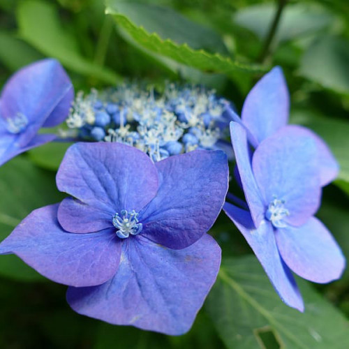 - пишні суцвіття діаметром 20 см складаються з маленьких стерильних квіток, на відтінок квітів може впливати pH ґрунту: синій колір на кислому ґрунті, а фіолетово-рожевий з"являється на більш лужних ґрунтах (див.фото);