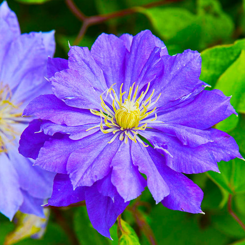 - квітки: світло-фіолетові або фіолетово-блакитні, напівмахрові або махрові, середні за розміром (близько 12 см у діаметрі), але дуже пишні завдяки величезній кількості чашолистків;