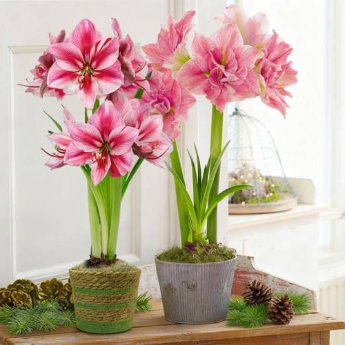 Замовляла цей комплект спеціально під новорічну фотозону вдома. Обидва гіпеаструми з набору — Sweet Nymph і Gervase — зацвіли майже одночасно, хоча стояли в різних горщиках. Квіти великі, рожеві з білим переливом, ніжні, але при цьому дуже помітні. Чесно, в живу ще кращі, ніж на фото магазину. Купувала в Яскрава Клумба, доставили за два дні, цибулини великі, сухі, без гнилі. Якщо хтось хоче купити гіпеаструм у подарунок, цей комплект ідеальний.