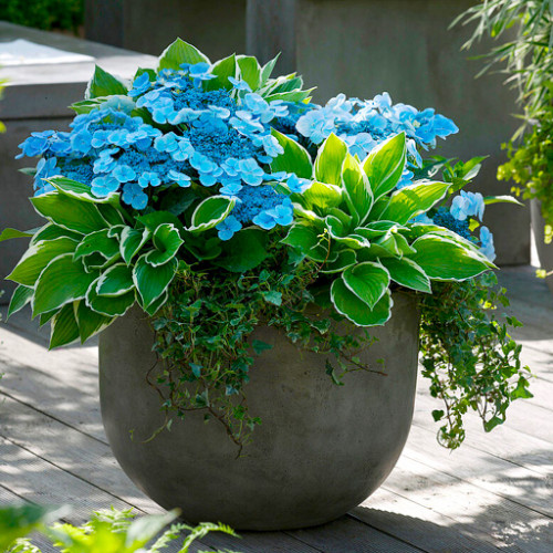 Це одне з найкращих і найпростіших у догляді поєднань у сучасному садівництві. Гортензія блакитна Bluebird чудово почувається у півтіні, де її ніжні квіти розкривають усю глибину кольору. Хоста Undulata Albomarginata теж віддає перевагу напівзатіненим місцям, де її широке строкате листя з білими облямівками виглядає особливо виразно. Саме тому вони стають ідеальними сусідами.