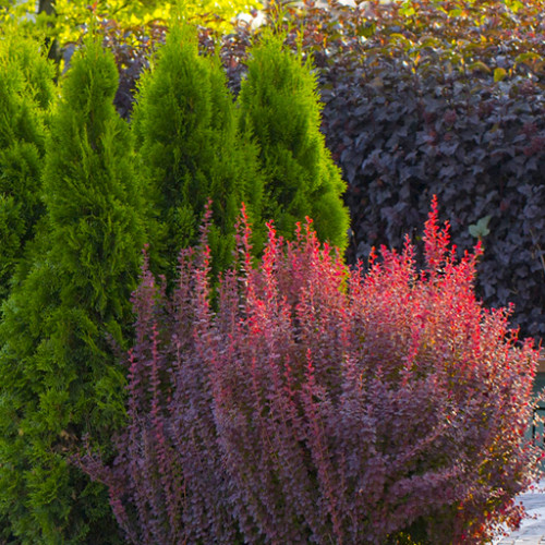 Барбарис Red Chief найкраще розташувати перед туями або в шаховому порядку, залишаючи відстань 60–70 см між кущами. Такий прийом дозволить підкреслити їх бордове листя на тлі зеленої хвої й водночас зробить насадження більш об’ємними.
