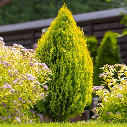 Розмістіть саджанці туї як акцент на задньому плані клумби або по центру композиції, а довкола неї висадіть спірею, яка завдяки золотистому листю та рожевому цвітінню створить яскравий обрамлений фон. Така пара підходить і для невеликих декоративних рабаток, і для міксбордерів. Яскравий дует виглядатиме привабливо від весни до пізньої осені, змінюючи відтінки й зберігаючи декоративність протягом усього сезону.