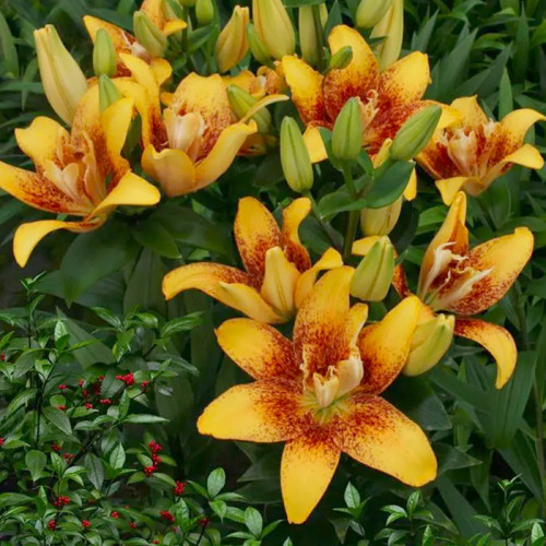 Мрієте про маленьке сонце, яке буде сяяти на вашій клумбі навіть у похмурий день? Лілія азіатська махрова Double Nugget – на відміну від класичних сортів, ця красуня формує багатошарові суцвіття насиченого лимонно-жовтого кольору, які нагадують витончені золоті злитки. Її головна особливість полягає у повній відсутності пилку, що робить квітку ідеальною для людей з алергією та неперевершеною для створення інтер'єрних букетів. Азіатські гібриди славляться своєю загартованістю, тому Дабл Наггет легко переносить українські зими без складного додаткового укриття. Кожен квітконос тримає ціле сузір'я бутонів, які розкриваються поступово, даруючи тривале та неймовірно пишне свято кольору. Додайте цей сорт до своєї садової колекції, і ви побачите, як простір навколо миттєво наповнюється теплом і аристократичною витонченістю.