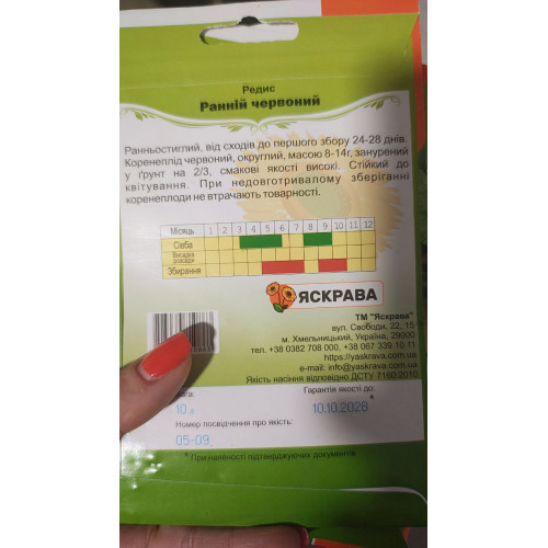 Купити недороге насіння редису відомої ТМ Яскрава за мінімальною ціною можливо на сайті фірмового магазину "Яскрава Клумба". Різноманітні сорти, необхідні добрива і все, що потрібно для вирощування відмінних овочів ви знайдете в нашому каталозі. Замовте насіння поштою або кур'єрами, і воно буде у вас вже через 1-3 дні. Свій вибір за умов доставки та оплати ви робите при оформленні замовлення.