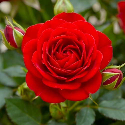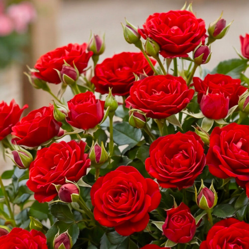 Троянда бордюрна Червона – сорт вражає інтенсивністю свого цвітіння: невеликий кущ кулястої форми густо вкривається численними махровими квітами яскраво-червоного, палкого кольору. Як демонструє фото, кожне суцвіття має правильну симетричну будову, а пелюстки зберігають насиченість пігменту навіть під прямими сонячними променями. Темно-зелене глянцеве листя створює ідеальний контраст, підкреслюючи вогняні відтінки пелюсток. Завдяки своїй мініатюрності та витривалості, ця троянда є незамінною для створення низьких живих бордюрів, оздоблення садових стежок та ефектного вирощування у вазонах на балконах чи терасах.