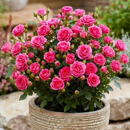 Троянда бордюрна Рожева – це справжня окраса для тих, хто прагне створити ефект безперервного квітучого бордюра на своїй ділянці. Як демонструє фото, цей сорт вирізняється надзвичайною рясністю цвітіння: компактний, акуратний кущ буквально всипаний невеликими махровими квітами класичного рожевого кольору. Завдяки своїй низькорослості та густому темно-зеленому листю, вона ідеально підходить для оформлення садових доріжок, переднього плану квітників, а також для вирощування у декоративних контейнерах та вазонах. Рожева бордюрна троянда цінується за високу стійкість до хвороб, здатність до швидкого повторного цвітіння та невибагливість у догляді, що робить її фаворитом як для професійного ландшафтного дизайну, так і для невеликих приватних садів.