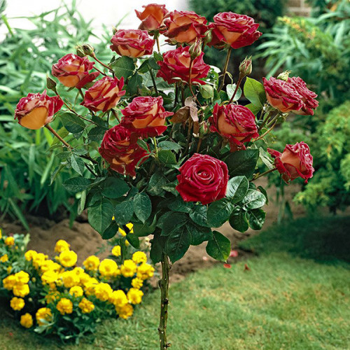 Штамбова троянда Eddy Mitchell - кращий варіант для створення унікального дизайну саду, парадної зони або улюбленого місця відпочинку. Крона складається з декількох щеплень, тому виглядає пишно. Елегантності додають бутони з золотисто-жовтими (зовнішня сторона) і бархатисто-червоними (внутрішня частина) пелюстками. У повному розпуску квітка залита чорно-бордовими тонами з бурштиновим доповненням. Культура відмінно виглядає на газоні, в оточенні низькорослих хвойників. Можливість вирощування в горщику дозволить прикрасити потрібну вам зону. Не варто боятися примхливості штамбових культур, виростивши саджанець від інтернет-магазину Яскрава Клумба, ви переконаєтеся у відмінній стійкості до захворювань і високих декоративних якостях.
