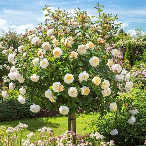 Популярні саджанці на штамбі – вирощують в фірмовому розпліднику Яскрава. Тому при мінімальній ціні ви може купити саджанці європейської якості. Коріння саджанця захищені від пересихання, вкриті особливим субстратом і спец-плівкою. Так коріння зберігаються свіжими. Перед посадкою – упаковку потрібно зняти, і розправити коріння, краще залишити саджанці в воді зі стимуляторами на ніч перед посадкою. Висаджують саджанці троянд, як навесні, так і восени. Але дуже важливо організувати надійне укриття на зиму. Наші експерти поділяться з вами секретами укриття штамба до зими, так ви збережете крону від пошкодження морозами.