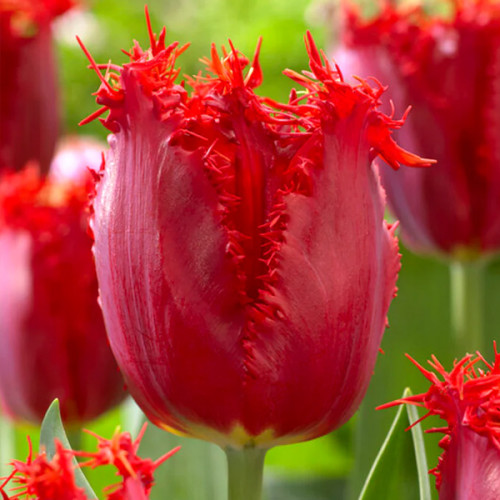 Тюльпан Philly Belle – ефектний оторочений сорт із глибоким червоним забарвленням та густою різьбленою кромкою пелюсток. Його бутони великі, келихоподібної форми, із щільною структурою та насиченим глянцевим блиском. Бахрома яскраво виділяється навіть здалеку, надаючи квітці динамічного та декоративного вигляду. Сорт стійкий до негоди та зберігає форму після дощів. Цвітіння стабільне, тривале, а колір не вигоряє на сонці. Philly Belle – вибір садівників, які люблять виразні, контрастні сорти з "характером".