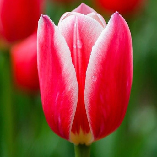 Candy Apple Delight – це тюльпан, який не залишиться непоміченим. Його виразне забарвлення ніби створене художником: насичений червоний колір поєднується з чисто-білою облямівкою по краях пелюсток. Такий контраст виглядає особливо ефектно у сонячну погоду, коли пелюстки ніби світяться зсередини. Квітка велика, на міцному та рівному стеблі, тримає форму навіть після дощів та вітру. Сорт цінують за стабільне цвітіння, декоративність та універсальність застосування. Він однаково добре виглядає у монопосадках, бордюрах, ландшафтних міксах та весняних букетах.