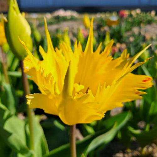 Якщо ви вважали, що Дарвінові гібриди - це лише класичні келихи, то Тюльпан Дарвіна Sunny Leo змусить вас змінити думку. Це справжній сонячний лев серед квітів: його пелюстки мають незвичну, злегка розсічену та загострену форму, що нагадує язики полум’я або розкішну гриву. Яскраво-жовтий, майже лимонний колір виглядає неймовірно соковито на фоні весняного неба, а легкі червоні штрихи по краях пелюсток додають бутону особливого драйву. «Санні Лео» - це вибір для сміливих садівників, які люблять дивувати та створювати акценти, що ламають стереотипи. Попри свою екзотичну зовнішність, сорт зберігає всі переваги своєї групи: він такий же витривалий, високий та стійкий до хвороб, як і класичні гібриди, але з набагато цікавішим «характером».