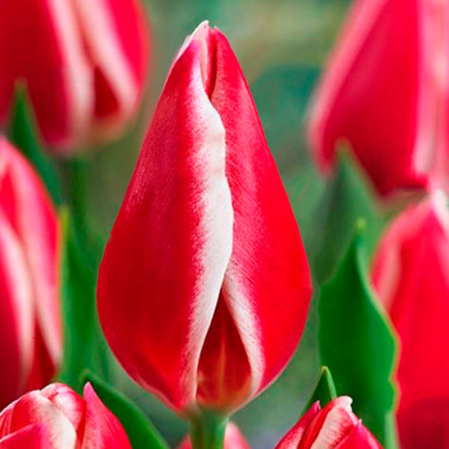 Якщо звичайні тюльпани вам вже набридли, придивіться до сорту Nashville. Він відразу виділяється завдяки яскравому контрасту: насичено-червоні пелюстки з широкими білими смугами вздовж боків. Таке забарвлення робить кожен бутон візуально об'ємним, а клумбу – живою та динамічною. У посадці цей тюльпан виглядає особливо ефектно: наче сад горить яскравими спалахами кольору.