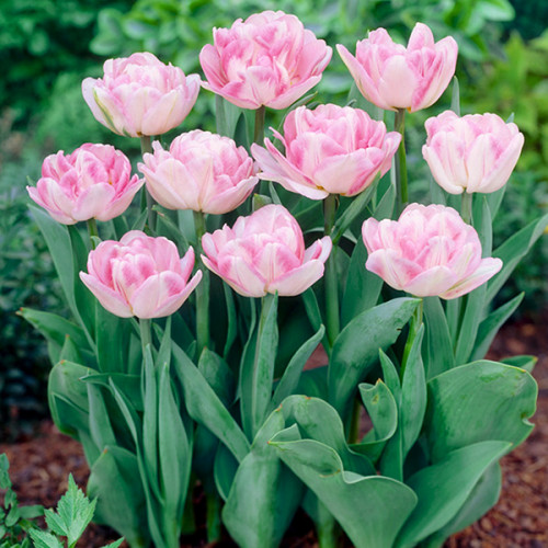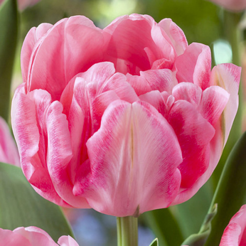 Тюльпан Foxtrot – популярний махровий сорт із щільними, пишними бутонами ніжно-рожевого кольору. Його великі квітки нагадують мініатюрні півонії: численні пелюстки щільно розташовані та створюють ефект об'ємного цвітіння. Забарвлення поступово змінюється в міру розкриття бутона – від блідо-рожевого на початку до насичено-рожевого з легким відтінком перламутрів у повному розпуску. Foxtrot цвіте одним із перших, стійкий до весняних похолодань і зберігає декоративність навіть після дощів. Завдяки акуратній формі та стійкості сорт широко використовується для озеленення клумб, контейнерних композицій та букетів.
