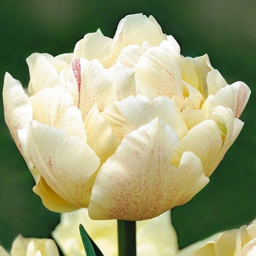 Montreux – це тюльпан, який ідеально впишеться у сад із романтичним настроєм. Його махрові бутони кремово-білі з тонкими рожевими мазками та легким перламутровим блиском. Пелюстки щільні, акуратно укладені в пишну, майже кулясту форму. Квітка виглядає ніжно і водночас впевнено – особливо коли повністю розпускається.