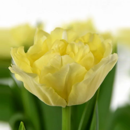 Verona Ice – це один із тих махрових тюльпанів, які хочеться розглядати. Він розпускається в пишну квітку з безліччю пелюсток – жовтих, з легким кремовим або ванільним відтінком. Зовні нагадує півонія або старовинну троянду, а завдяки великій цибулині 12/+ – цвітіння потужне і стабільне вже в перший рік.