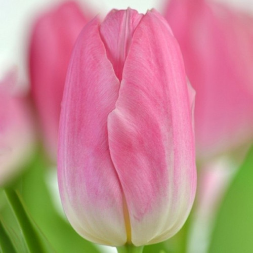 Тюльпан Тріумф Dynasty – популярний двоколірний сорт з м'яким переходом від насичено-рожевого верху до світло-рожевої або майже білої основи пелюсток. Квітка виглядає витончено та акуратно, з великим келихоподібним бутоном та ідеально рівною формою. Відтінок не вигоряє на сонці та зберігає свіжість протягом усього цвітіння. За прохолоднішої погоди рожевий колір стає трохи інтенсивнішим, а в теплі дні проявляється делікатний перламутровий блиск.