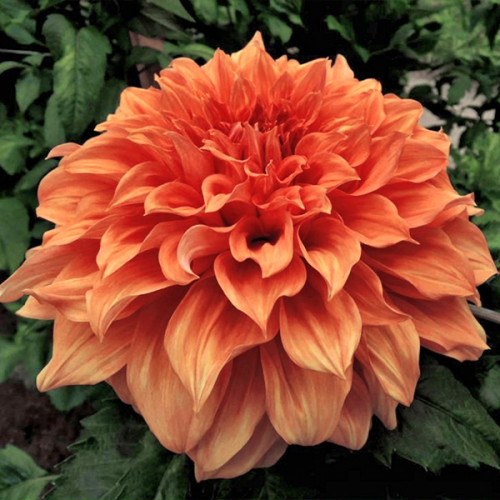 - описание цветка: бутон пышный, крупный, достигает в пик цветения 25 см, лепестки слегка закручены, окрашены в однотонный оранжево-бронзовый оттенок;