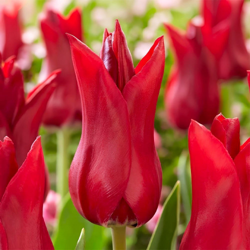 Elegant Madam – эффектный лилиевидный тюльпан глубокого красного оттенка с характерной вытянутой формой бутона и чётко загнутыми наружу кончиками лепестков. Цветок выглядит стройно, аккуратно и выразительно даже в плотных посадках. Насыщенный красный цвет остаётся стабильным на солнце и не выгорает, а лилиевидная форма делает сорт более утончённым по сравнению с классическими тюльпанами.