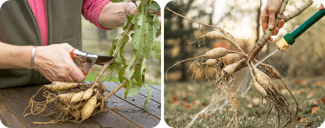 - Лучше всего вынуть клубни из почвы, очистить и просушить. Но есть и другой вариант: оставить их в горшке, предварительно убрав большую часть почвы.