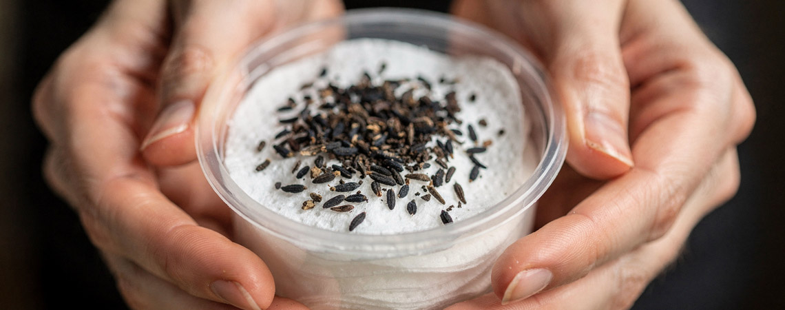 Для очень мелких семян (например, земляники или лаванды) поверх почвы можно выложить слой снега, слегка уплотнить его и равномерно распределить семена по поверхности.