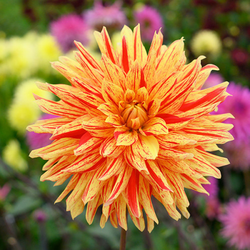 Кактусова червоно-жовта жоржина високогросла сорту Стріпед Вулкан - це справжня садова прикраса. Перші барвисті бутони розкриваються ще наприкінці червня або на початку липня, а цвітіння триває до самих заморозків. Серед численних сортів квітів жоржин саме цей вид багато хто вирощує на зріз. Букети виходять просто шикарними, бутони довго зберігають свою свіжість.