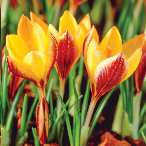Крокус Bronze Form – ботанічний сорт вузьколистого крокусу, який зацвітає одним із перших навесні та миттєво перетворює сад. Його витончені вузькі пелюстки забарвлені в насичений золотисто-бронзовий колір з м'яким відтінком карамельного, а витончена форма квітки підкреслюється контрастною темною серединкою. Ці мініатюрні первоцвіти особливо гарні в натуралістичних посадках, на газонах, у бордюрах і кам'янистих садах, де вони швидко розростаються щільними килимками і повертаються щорічно, радуючи раннім цвітінням.