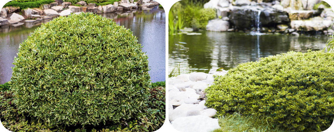 - Декоративні трави. Міскантус – рослини для сонячної сторони водойми. Декоративні трави виглядають біля води доречно і гармонійно. Висота куща із суцвіттями може досягати 2 м і більше. На першому плані добре доповнюватимуть композицію садові деревії різного забарвлення суцвіть, ліатриси та ін. Прекрасно виглядають у прибережних композиціях та еремурусах. Навесні вони вирощують розетку вузького сріблястого листя, а в середині літа дають високі до 150 см величезні суцвіття-свічки.