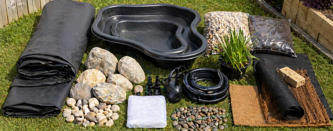 Тепер настав етап вибору матеріалів для створення водойми. Найпростіший спосіб – купити готову пластикову форму. Вони є різних форм-факторів та розмірів, з уже сформованою прибережною зоною, різними рівнями, які вивірені по глибині. Якщо ви вирішили використовувати гнучкі матеріали для гідроізоляції водоймища – то їх сьогодні безліч, від звичайної плівки до довговічної бутил-каучукової гуми. Можна формувати водоймище бетонуванням, а потім покрити бетон спец-матеріалами. Це питання варто окремо вивчити. Як правило, всі великі водоймища потребують очищення води, спеціального обладнання та ін. Проконсультуйтеся з фахівцями.